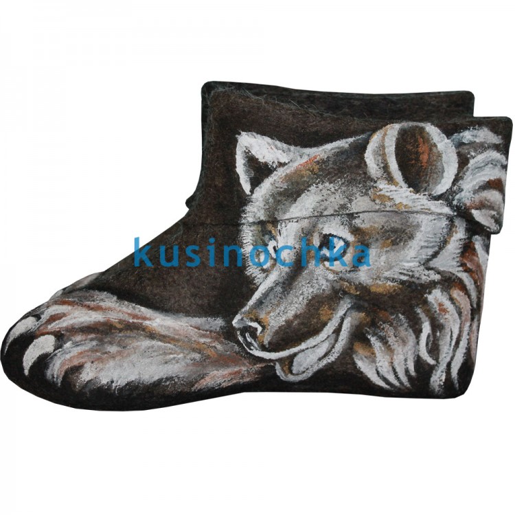 Теплые мужские короткие валенки-самокатки из натуральной шерсти с дизайнерским рисунком акриловыми красками в виде медвежьей мордой, уютно расположившейся на лапе. Мужские короткие валенки это не только обувь для деревни, но и очень теплая и модная зимняя обувь для наших мужчин.