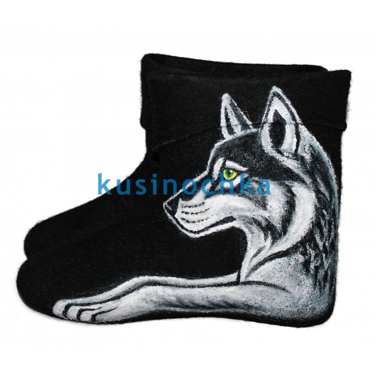 Теплые мужские короткие валенки-самокатки из натуральной шерсти с дизайнерским рисунком акриловыми красками волка, строго смотрящего на нас. Мужские короткие валенки это не только обувь для деревни, но и очень теплая и модная зимняя обувь для наших мужчин.