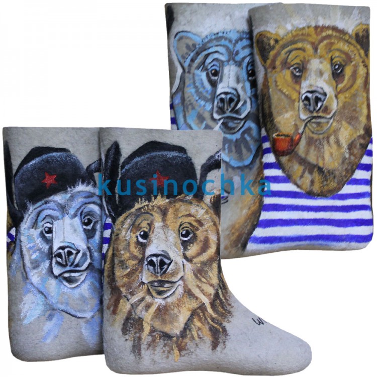 Подарите своему мужчине очень стильные и красивые мужские валенки-самокатки из натуральной шерсти с дизайнерским рисунком акриловыми красками в виде бурого и белого медведя c одной стороны валенок они в шапках ушанках, а с другой в тельняшках и с трубкой в пасти. Такой подарок на Новый год или 23 февраля точно придется по вкусу Вашему мужчине.