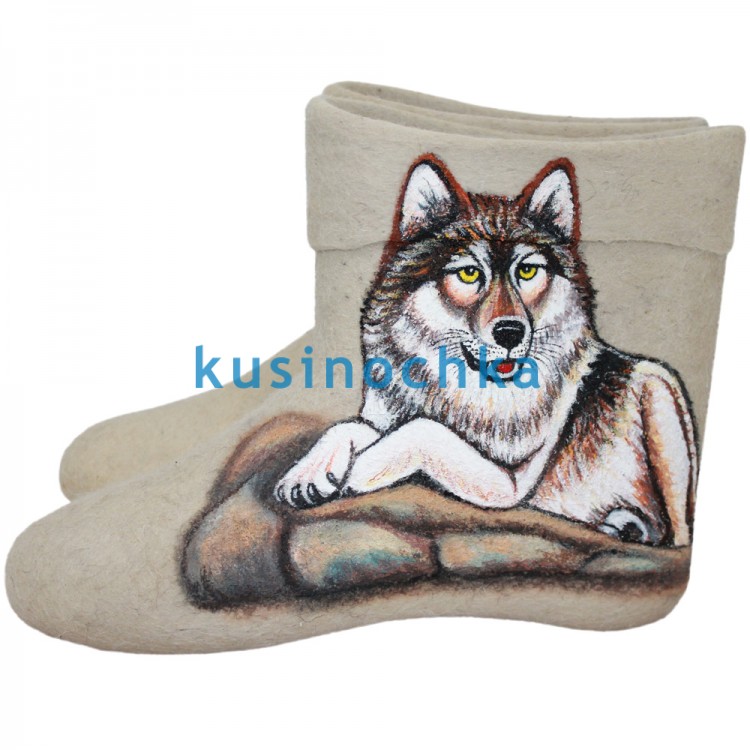 Теплые мужские короткие валенки-самокатки из натуральной шерсти с дизайнерским рисунком акриловыми красками волчицы, ежащей на земле. Мужские короткие валенки это не только обувь для деревни, но и очень теплая и модная зимняя обувь для наших мужчин.
