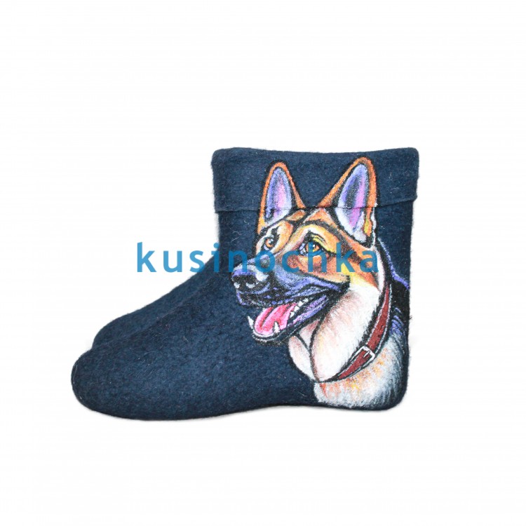 Теплые мужские короткие валенки-самокатки из натуральной шерсти с дизайнерским рисунком акриловыми с ликом немецкой овчарки, любимицы многих владельцев собак. Мужские короткие валенки это не только обувь для деревни, но и очень теплая и модная зимняя обувь для наших мужчин.