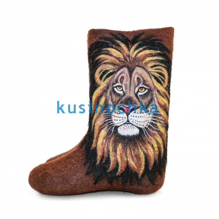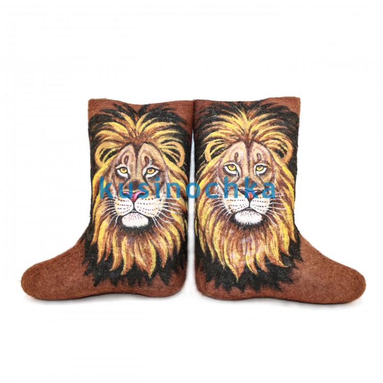 Валенки мужские с рисунком "Король Лев". Валенки - самокатки сваляны вручную с добавлением специального красителя для шерсти коричневого цвета. Валенки расписаны акриловыми красками.