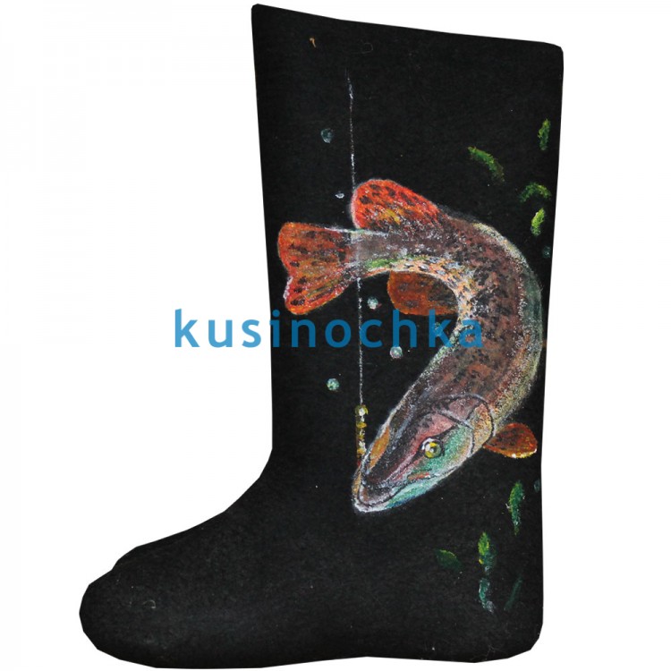 Подарите своему деду, папе, мужу, сыну или внуку - любителям рыбной ловли наши валенки-самокатки с пойманной на крючок щукой и они точно не останутся равнодушны к такому подарку. А если Вы купите им еще и силиконовые галоши на них, то лучше и краше них никого не будет на речном берегу. А самое главное, что в наших валенках ноги никогда не потеют и поэтому они всегда в тепле. Тип декора - акриловые краски.