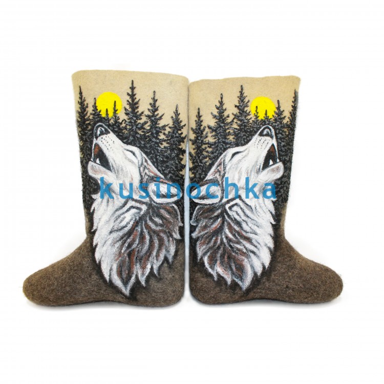 Классические мужские валенки-самокатки из натуральной шерсти с дизайнерским рисунком акриловыми красками в виде волка,воющего на луну.Мужские валенки это не просто цветные валенки, но и очень теплая и модная зимняя обувь для наших дорогих мужчин.