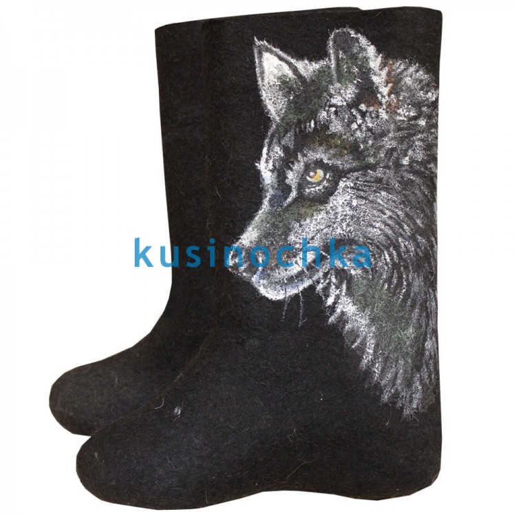 Теплые мужские валенки-самокатки из натуральной шерсти с дизайнерским рисунком акриловыми красками в виде волчьей морды. Мужские валенки это не только простые деревенские черные валенки для рыбаков и охотников, но и теплая современная зимняя обувь для наших дорогих мужчин.