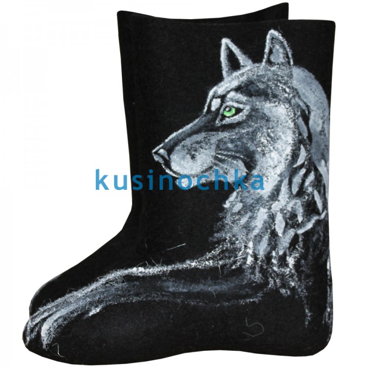Теплые мужские валенки-самокатки из натуральной шерсти с дизайнерским рисунком акриловыми красками - ликом гордого волка. Мужские валенки это не только простые деревенские черные валенки для рыбаков и охотников, но и теплая современная зимняя обувь для наших дорогих мужчин.