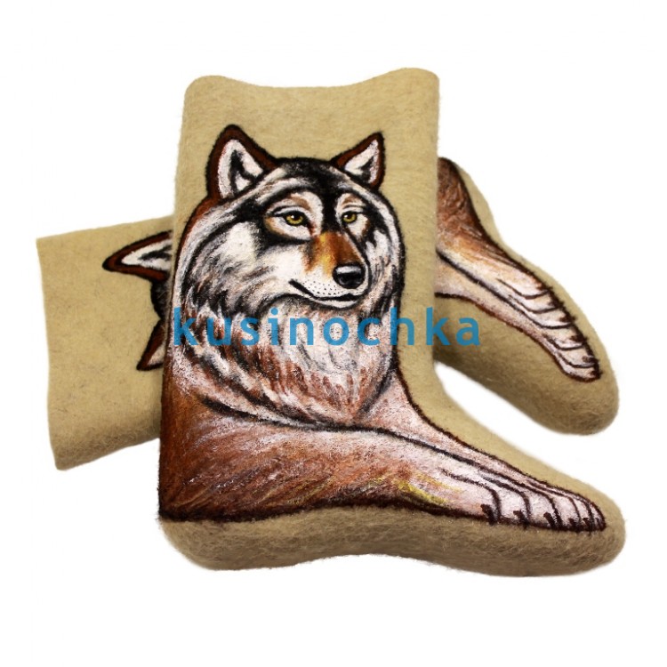 Полноразмерные валенки ручной валки на светлой основе, с художественным рисунком: сидящий волк, изображённый в фас или в три четверти. Образ стилизован — без угрозы, с выразительной, но спокойной осанкой: прямая спина, поднятая голова, внимательный взгляд. Фон минимален — акцент сделан на фигуре.