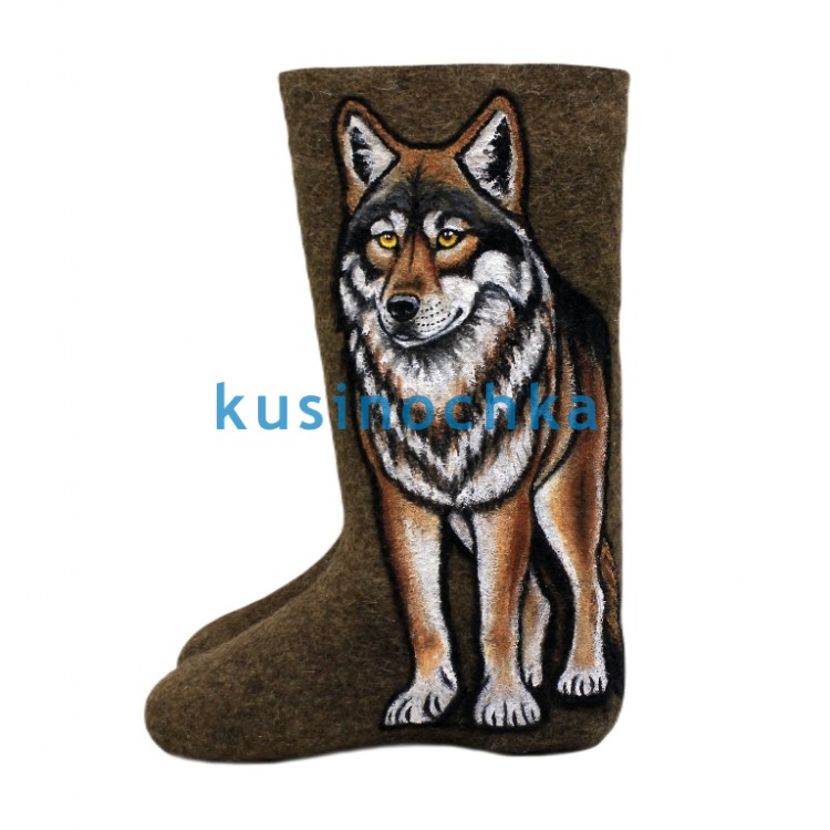 Полноразмерные валенки ручной валки на тёмно-серой основе, с рисунком: волк стоит, настороженно смотрит вперёд. Поза — собранная, но не напряжённая: лапы под телом, хвост опущен, уши направлены вперёд. Фон минимален — акцент на фигуре.